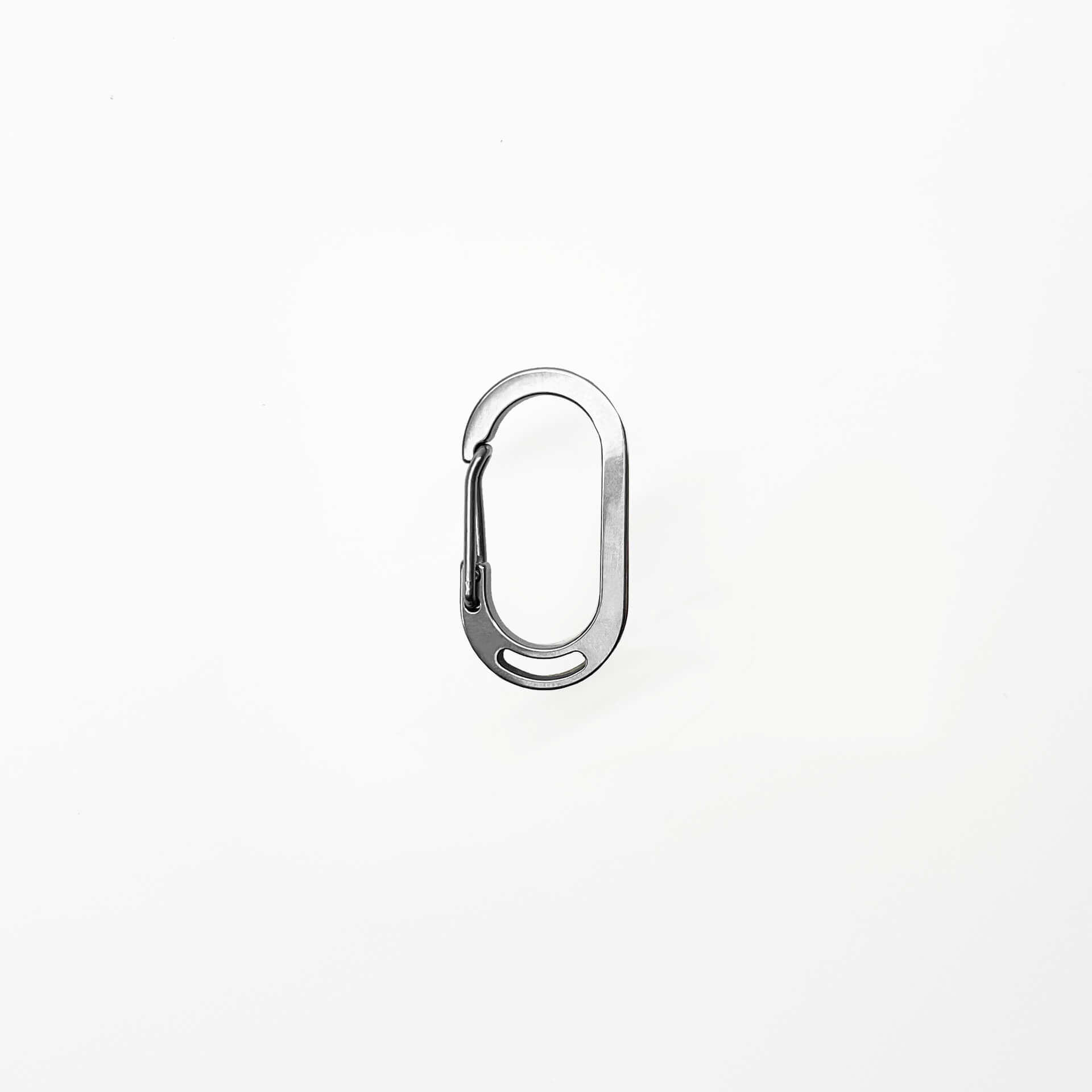 A small and durable carabiner made of stainless steel, designed to seamlessly fit with the 190+ Organizer and mesh bag for versatile attachment options.